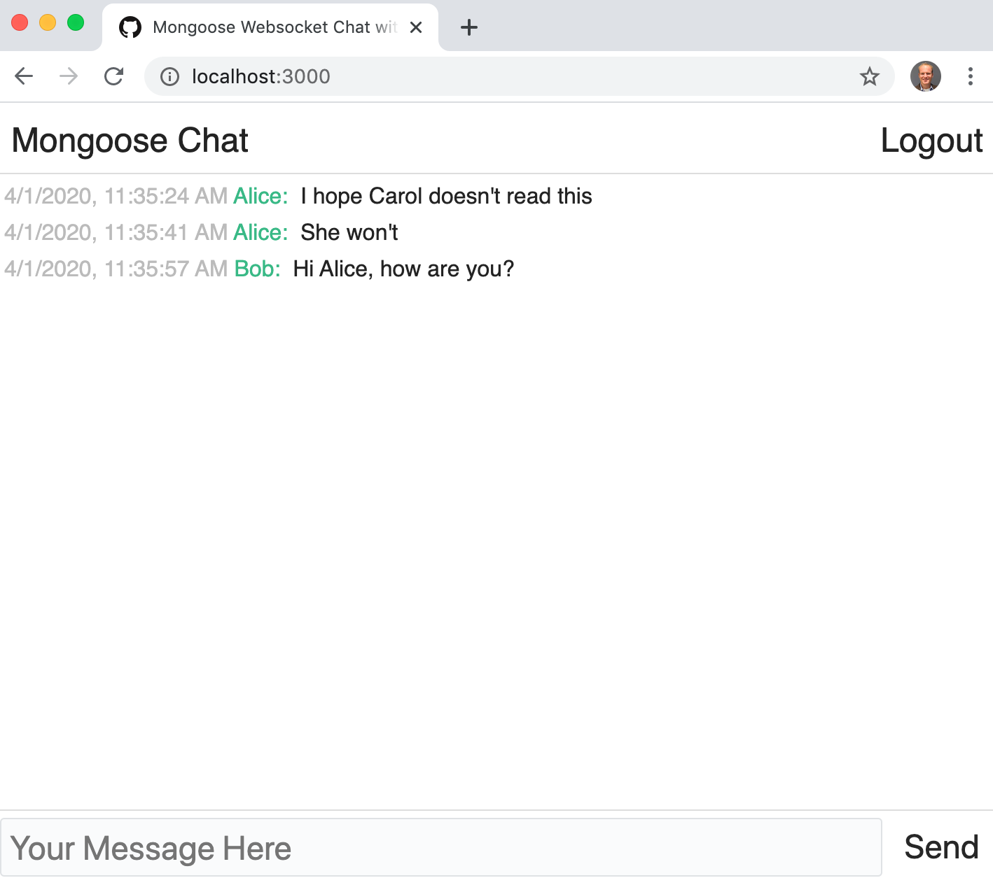 The backend is powered by Express and ws. The app demonstrates how to use the same port for both HTTP and websockets, as well as how to integrate Mongoose with websockets.