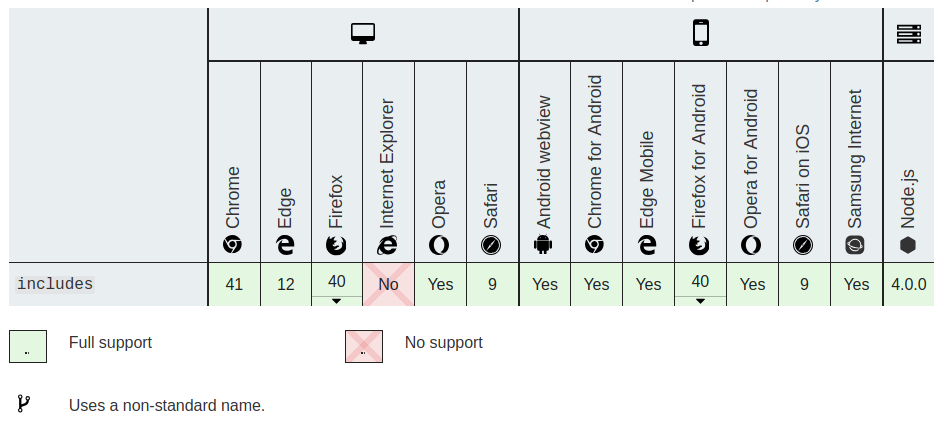 In general, if you have any doubt about whether code will run in an environment that supports includes(), you should use indexOf(). The includes() function's syntax is only marginally more concise than indexOf().