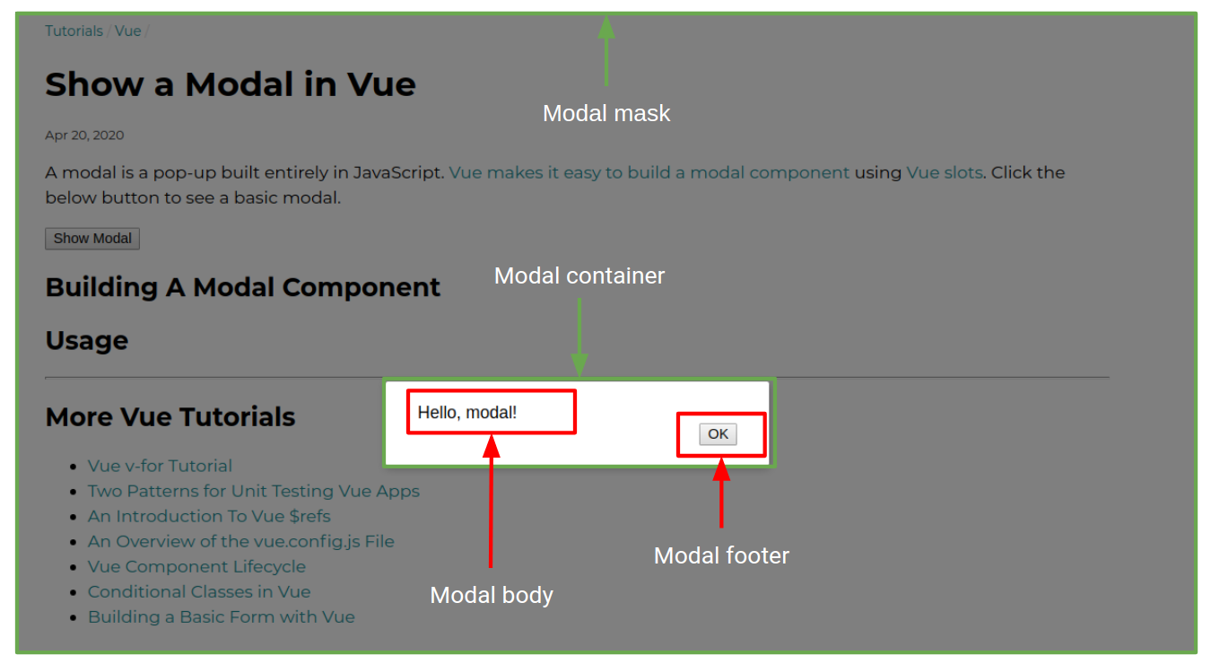 A modal is a pop-up built entirely in JavaScript. Vue makes it easy to build a modal component using Vue slots. Click the below button to see a basic modal.